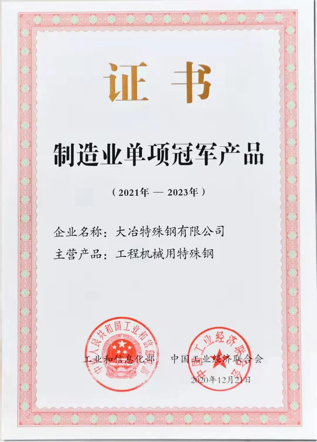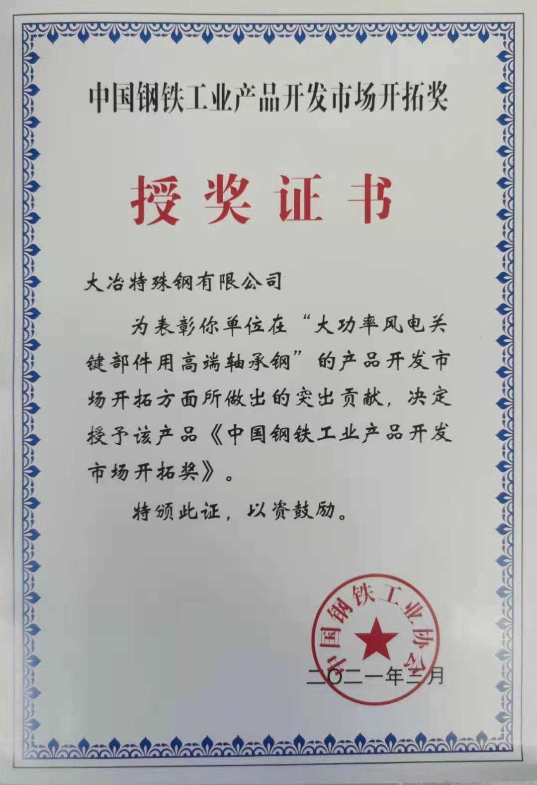 中國(guó)鋼鐵(tiě)工(gōng)業(yè)産品開(kāi)發市(shì)場(chǎng)開(kā i)拓獎