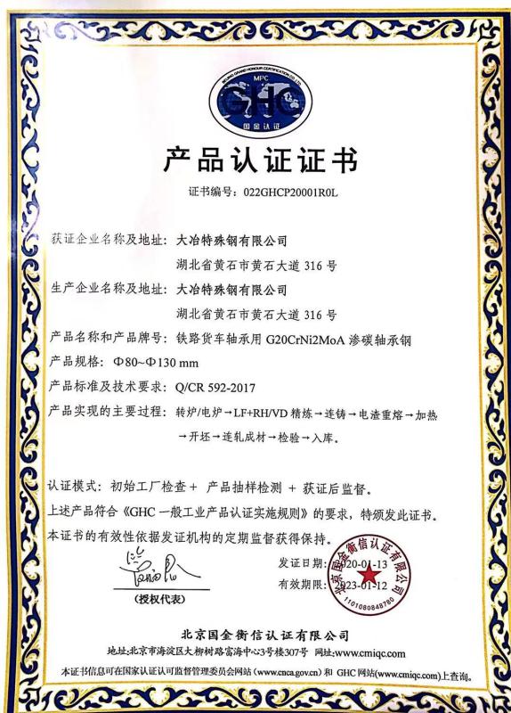 鐵(tiě)路(lù)貨車(chē)軸承用(yòng)G20滲碳軸承鋼産品認證證書(shū)