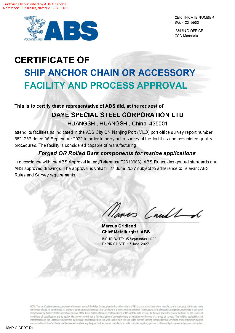 美(měi)國(guó)船(chuán)級社ABS錨鏈鋼工(gōng)廠(chǎng)認可(kě)證書(shū)