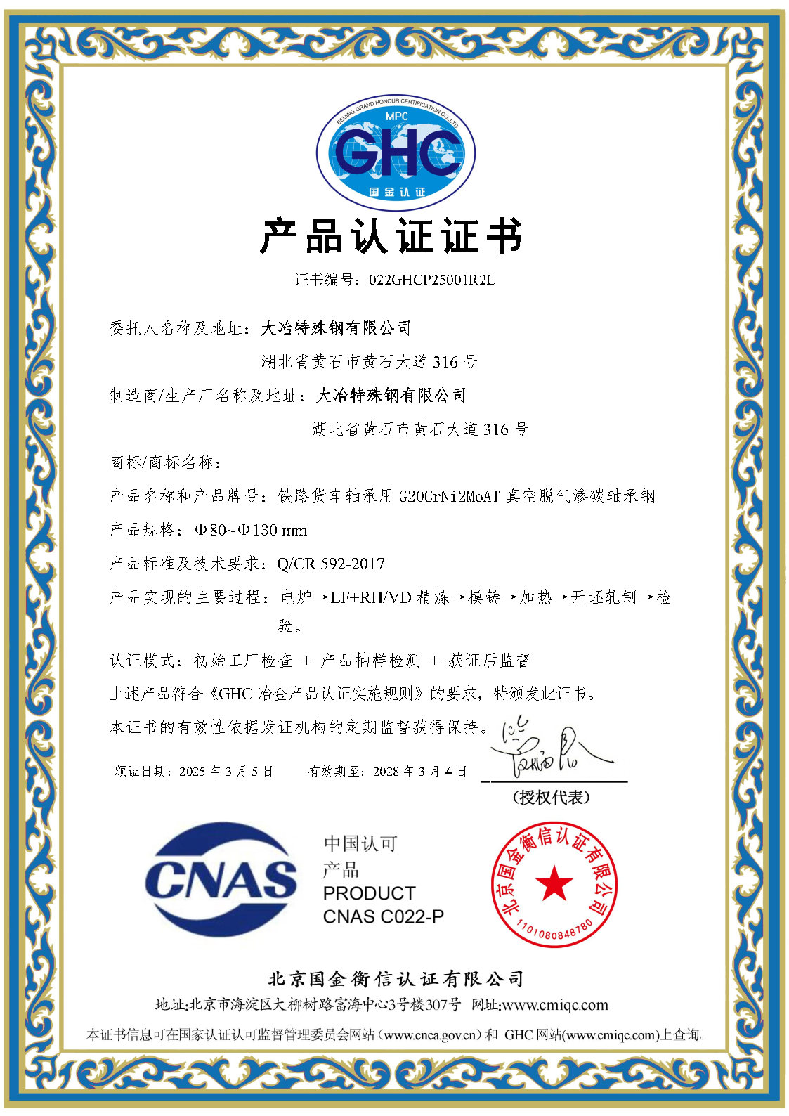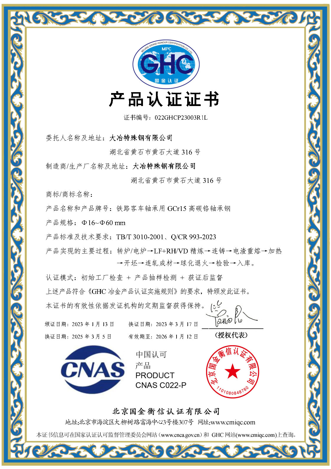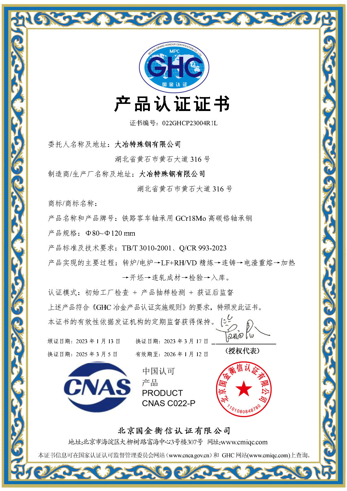 鐵(tiě)路(lù)客車(chē)軸承用(yòng) GCr18Mo 高(gāo)碳鉻軸承鋼産品認證證書(shū)