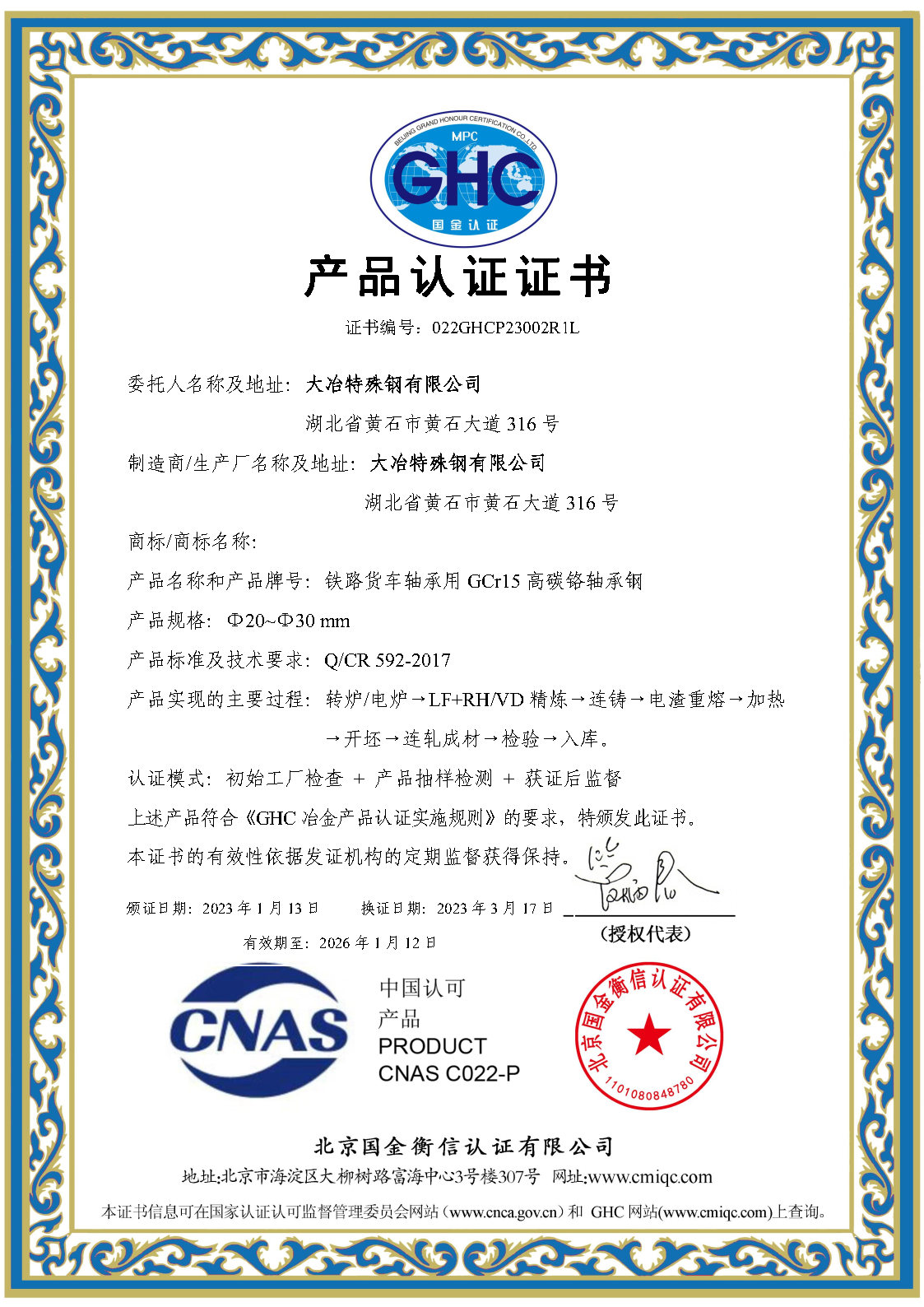 鐵(tiě)路(lù)貨車(chē)軸承用(yòng)GCr15高(gāo)碳鉻軸承鋼産品認證證書(↓shū)
